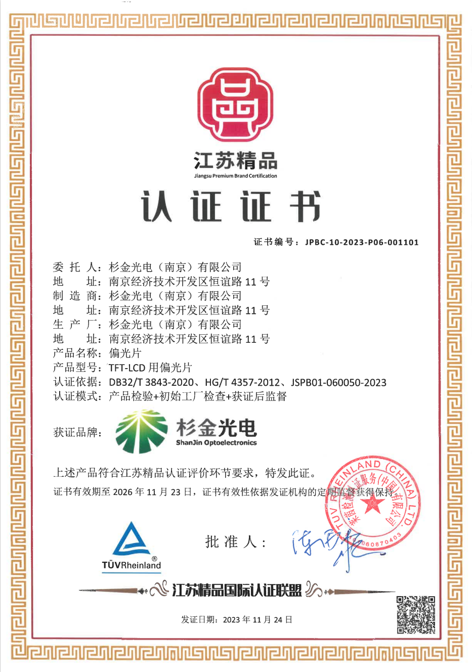 近日,杉金光电成功荣获“江苏精品”认证,这是对公司在偏光片领域卓越品质和持续创新的充分肯定。