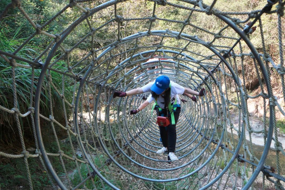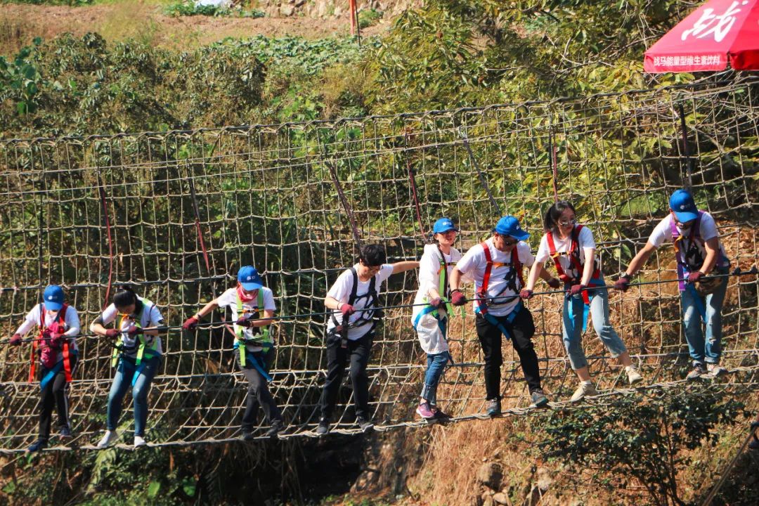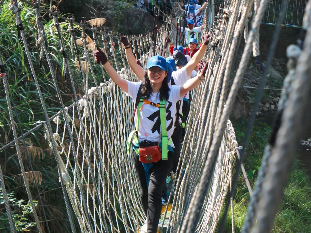 全部悬空的16道桥索仅靠一条安全绳和一双手套,杉杉股份全员顺利抵达终点。