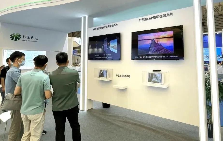 除了户外显示用偏光片,杉金光电还带来了TFT-LCD TV 叠屏用改善彩虹纹偏光片、TFT-LCD TV提升色域LAP偏光片、TFT-LCD TV用超薄偏光片荣获显示材料创新银奖。以及适用于车载屏、手机等场景的各类偏光片产品。